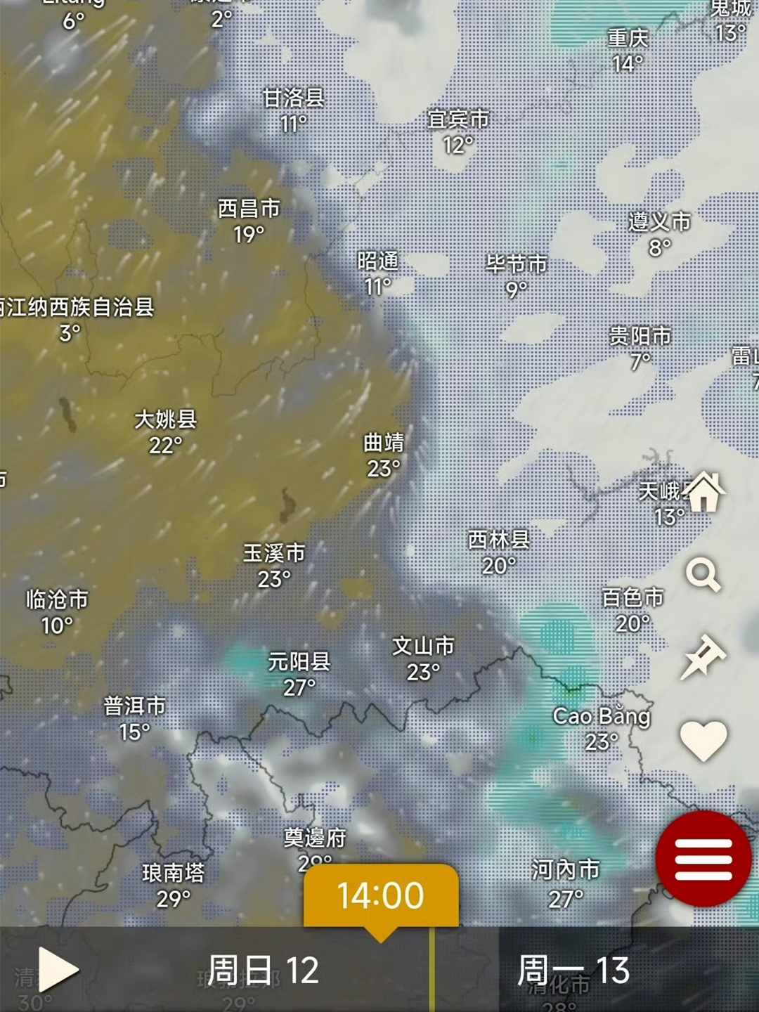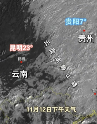 11月13日,南下冷空气翻过乌蒙山,推动云贵准静止锋进入云南,在冷空气东北风压制下,叠加阴雨,导致云南东部出现了剧烈降温,而且出现倒降,下午气温低于凌晨。广南同比14时降温15.8°℃,成为当天14时降温最强站点。