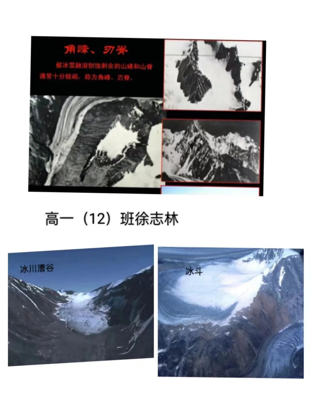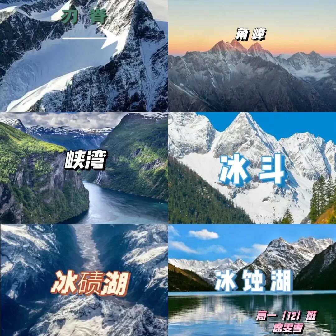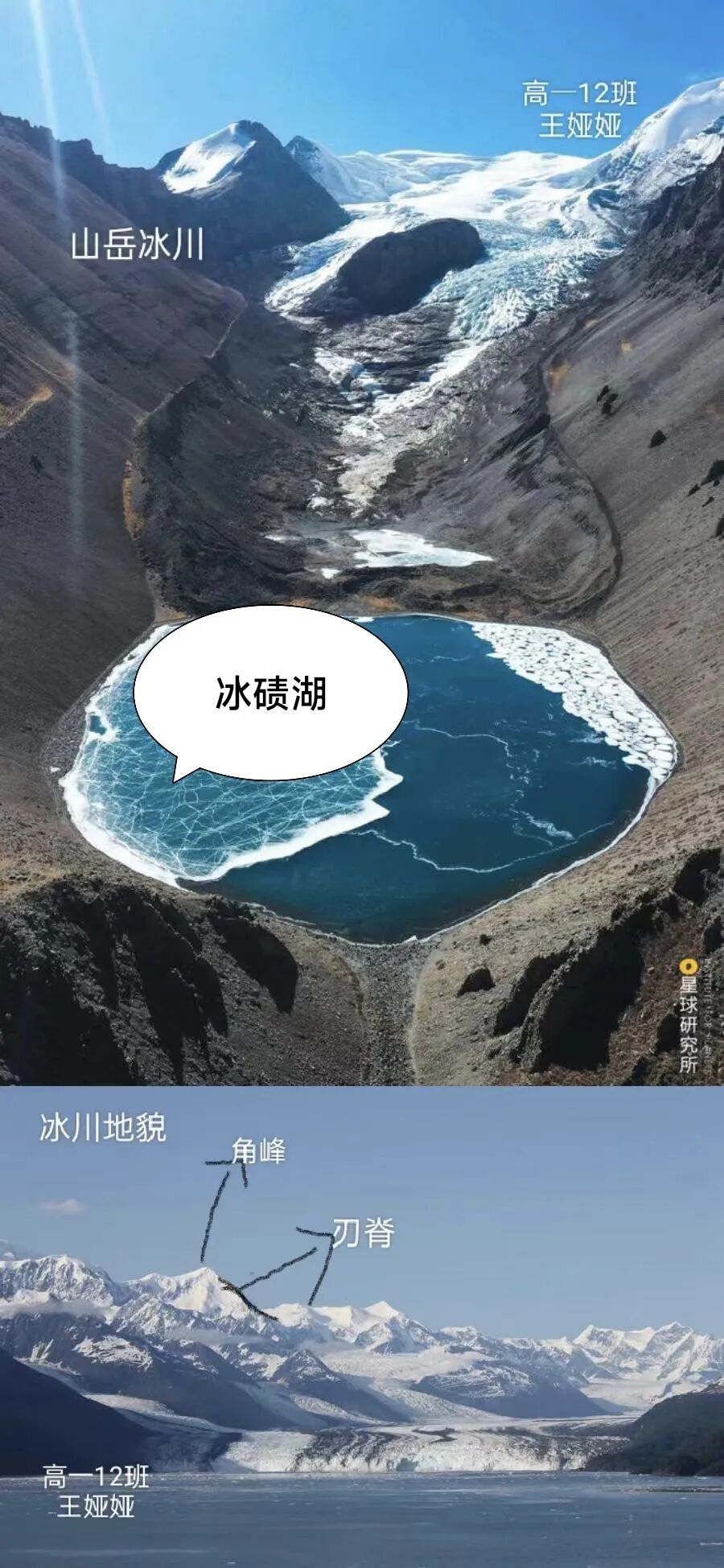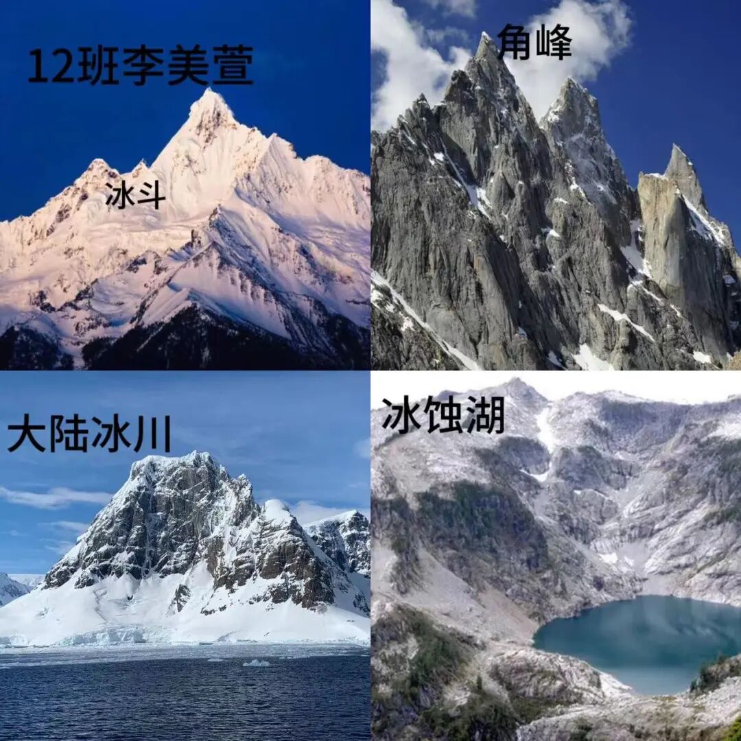 本次实践作业为:查找关于冰川的图片资料并标明地形类型(如:角峰、刃脊、冰斗、U形谷、峡湾、冰蚀湖、冰碛湖)、或者拍摄关于冰川的图片,下列图片为2023级12班的部分作业选登。