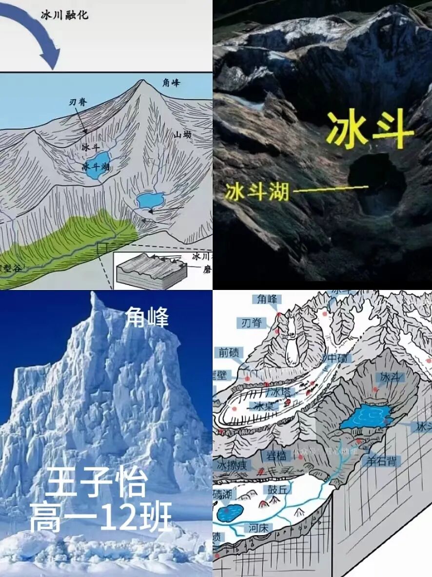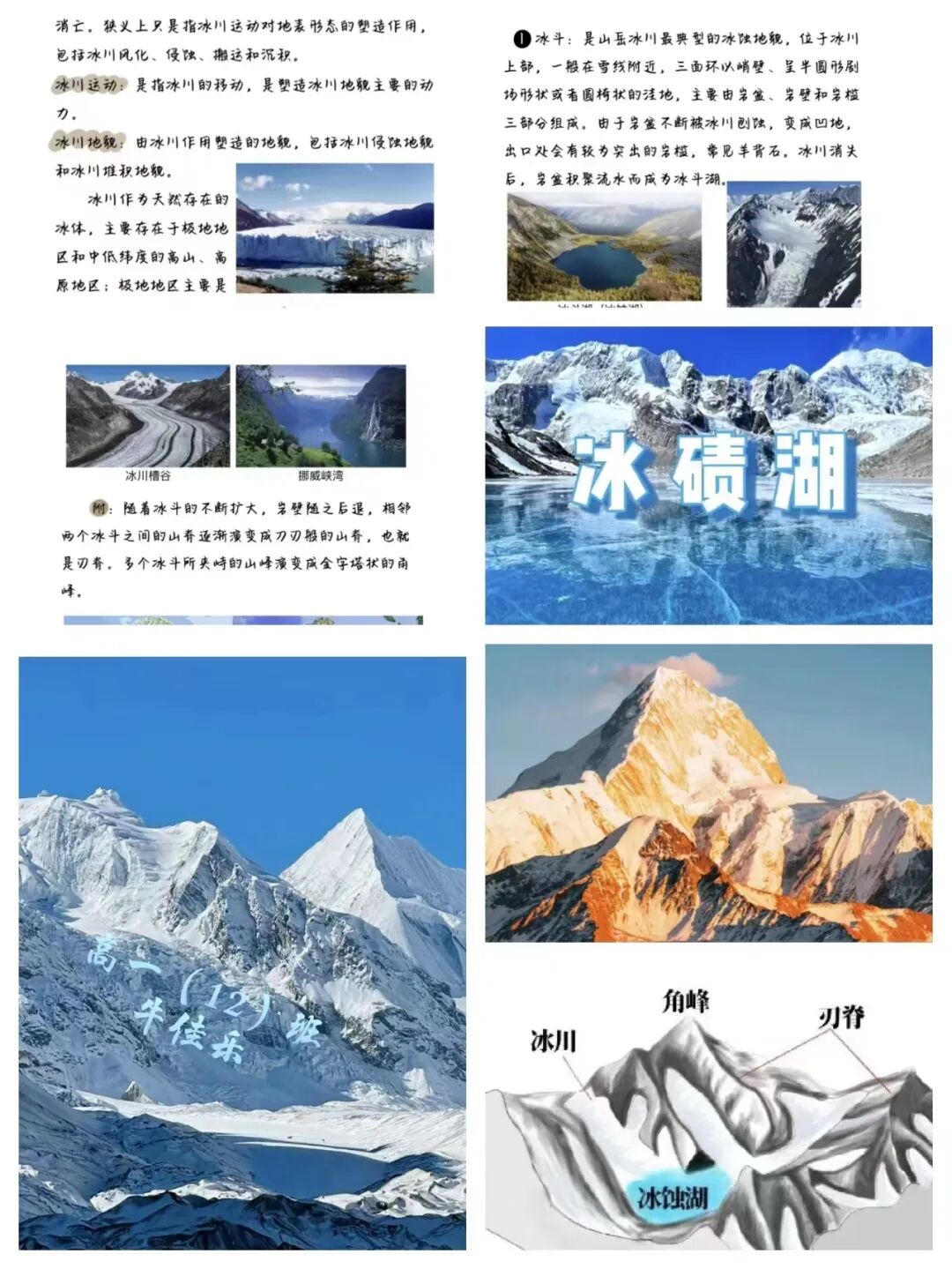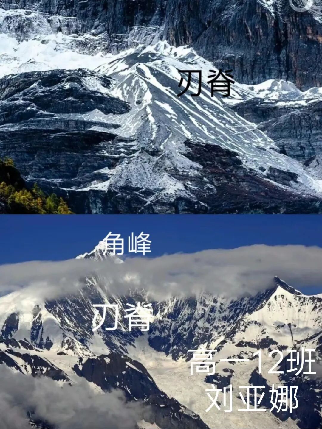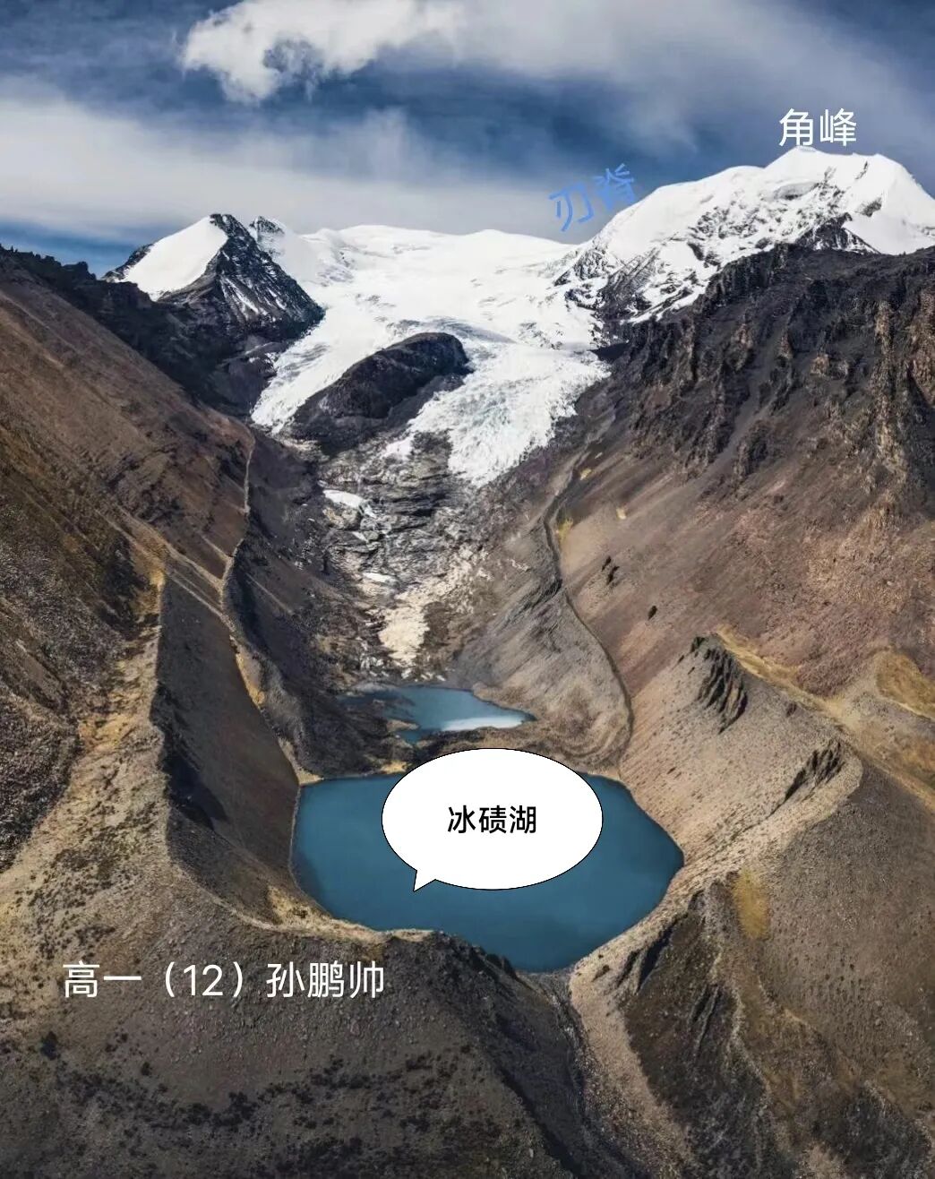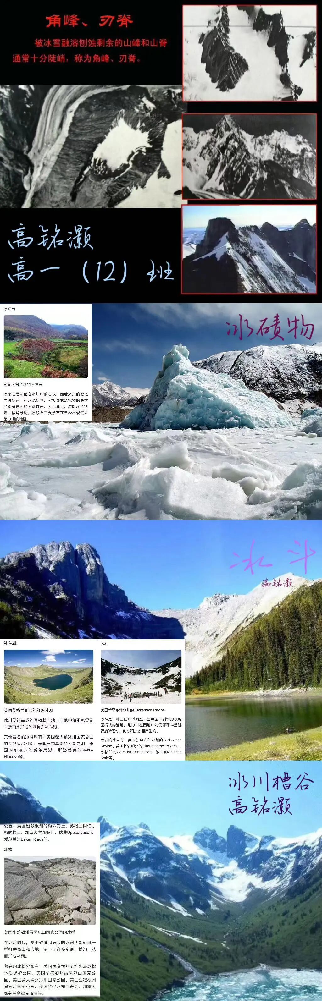 本次实践作业为:查找关于冰川的图片资料并标明地形类型(如:角峰、刃脊、冰斗、U形谷、峡湾、冰蚀湖、冰碛湖)、或者拍摄关于冰川的图片,下列图片为2023级12班的部分作业选登。