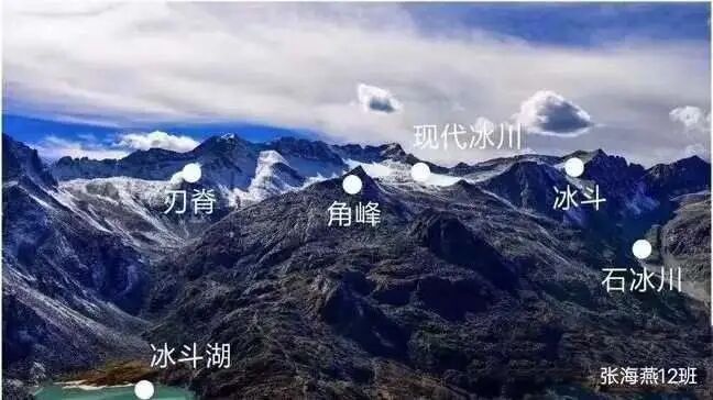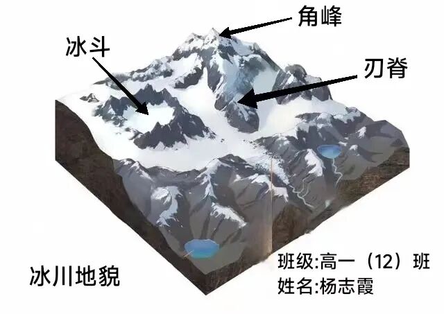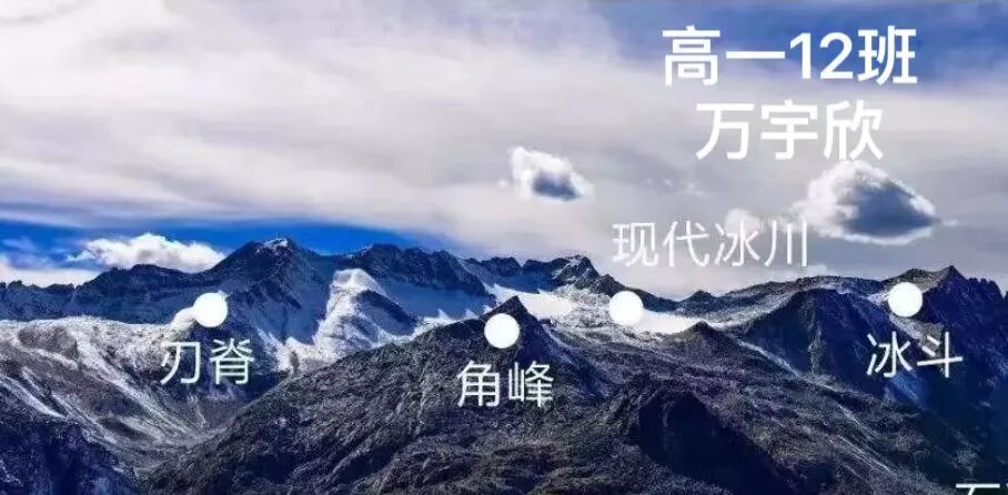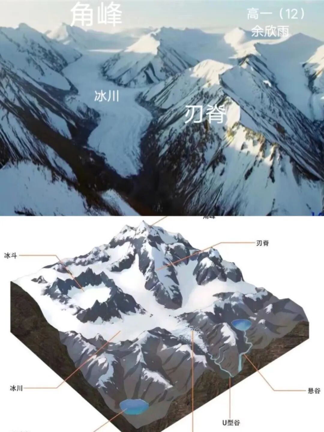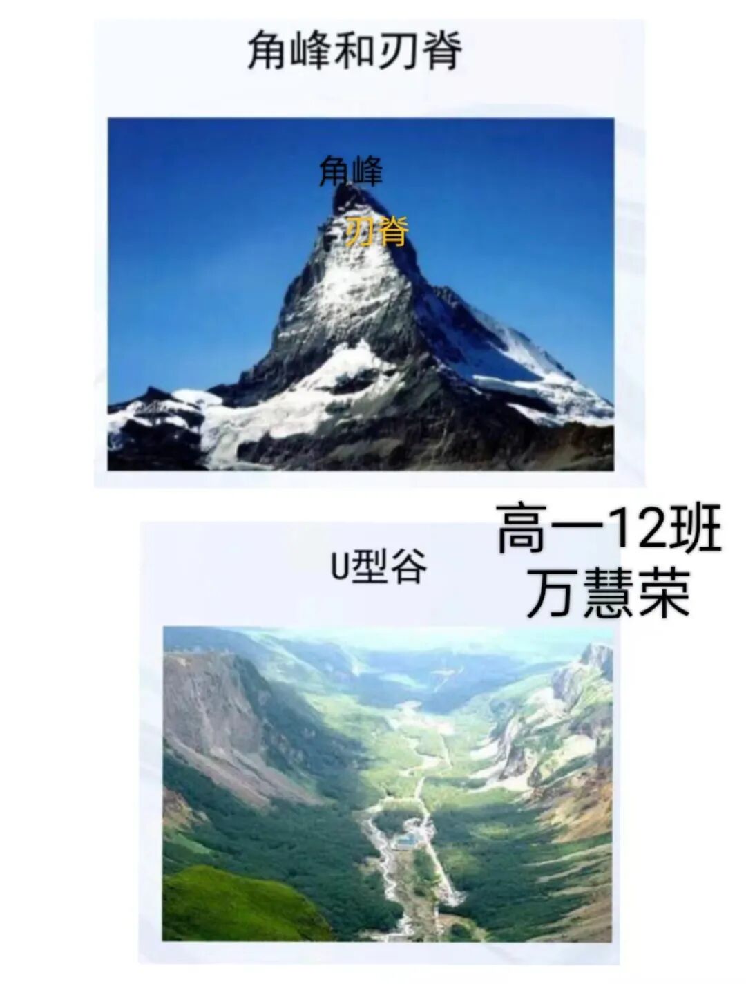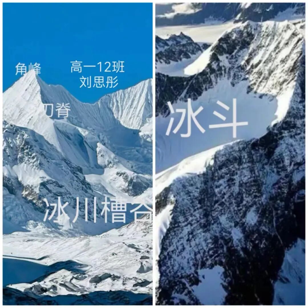 本次实践作业为:查找关于冰川的图片资料并标明地形类型(如:角峰、刃脊、冰斗、U形谷、峡湾、冰蚀湖、冰碛湖)、或者拍摄关于冰川的图片,下列图片为2023级12班的部分作业选登。