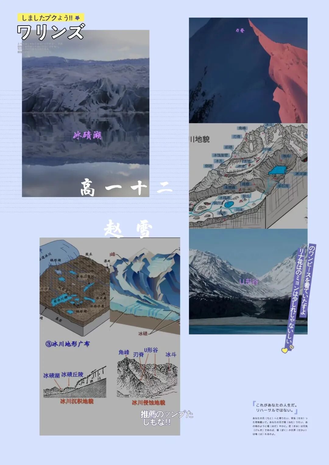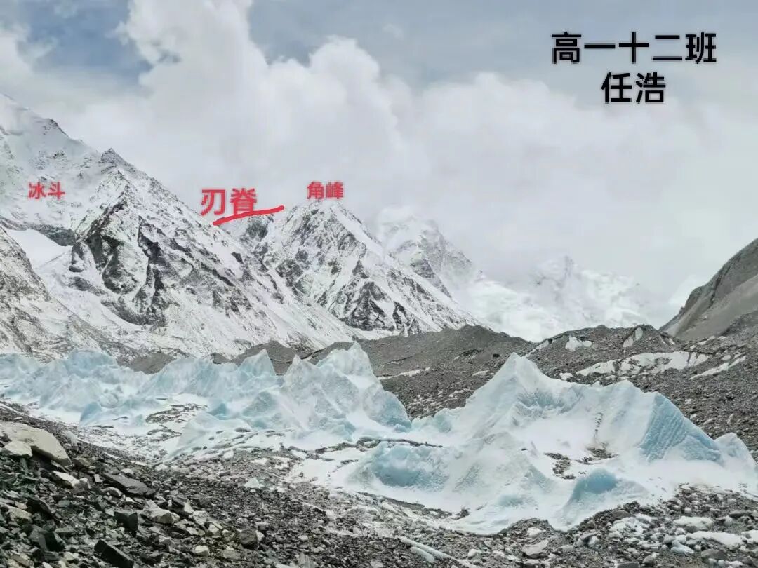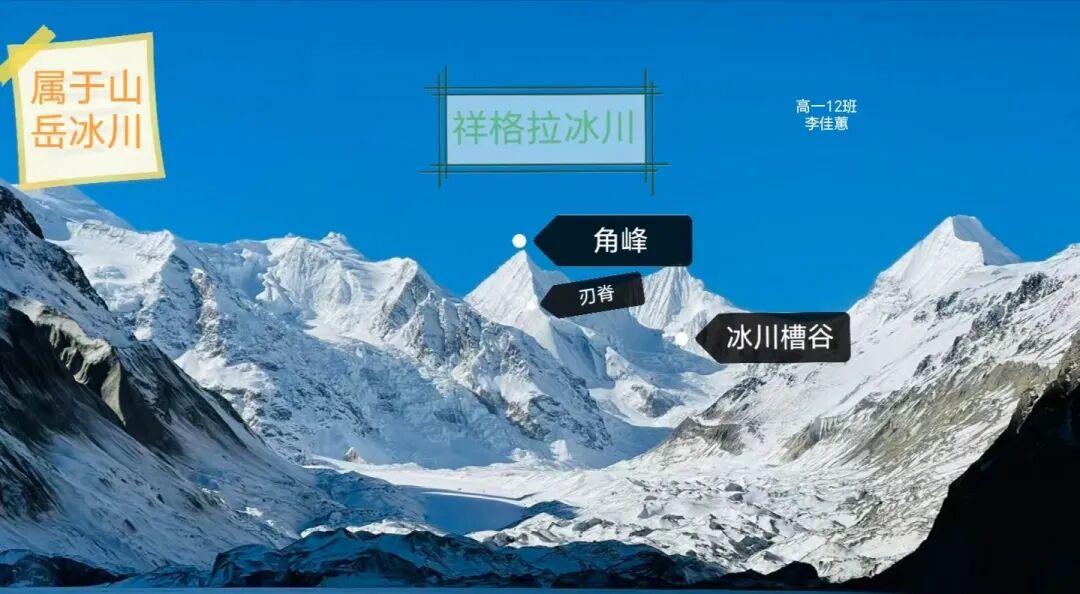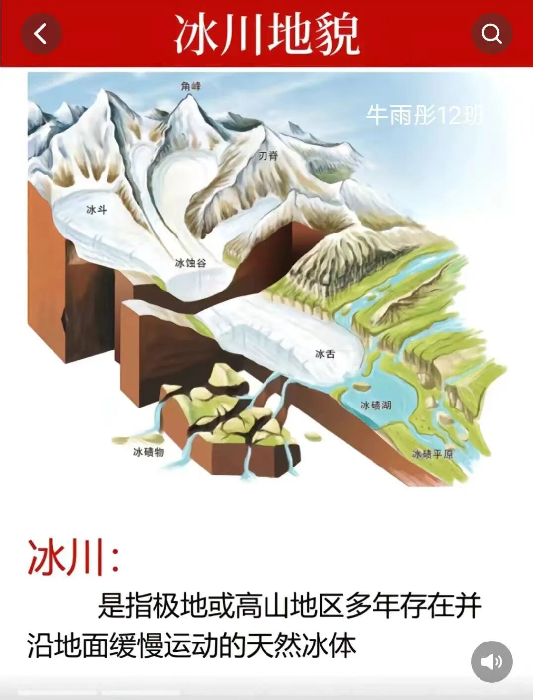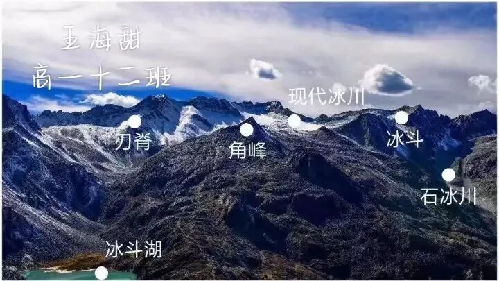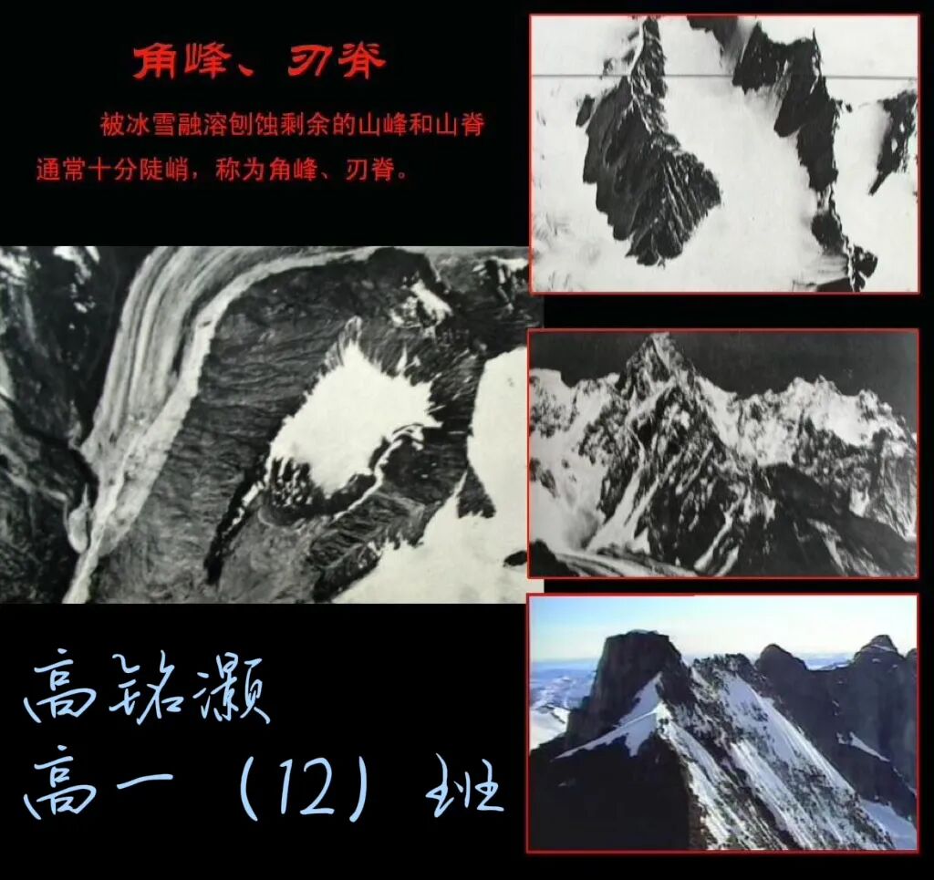 本次实践作业为:查找关于冰川的图片资料并标明地形类型(如:角峰、刃脊、冰斗、U形谷、峡湾、冰蚀湖、冰碛湖)、或者拍摄关于冰川的图片,下列图片为2023级12班的部分作业选登。