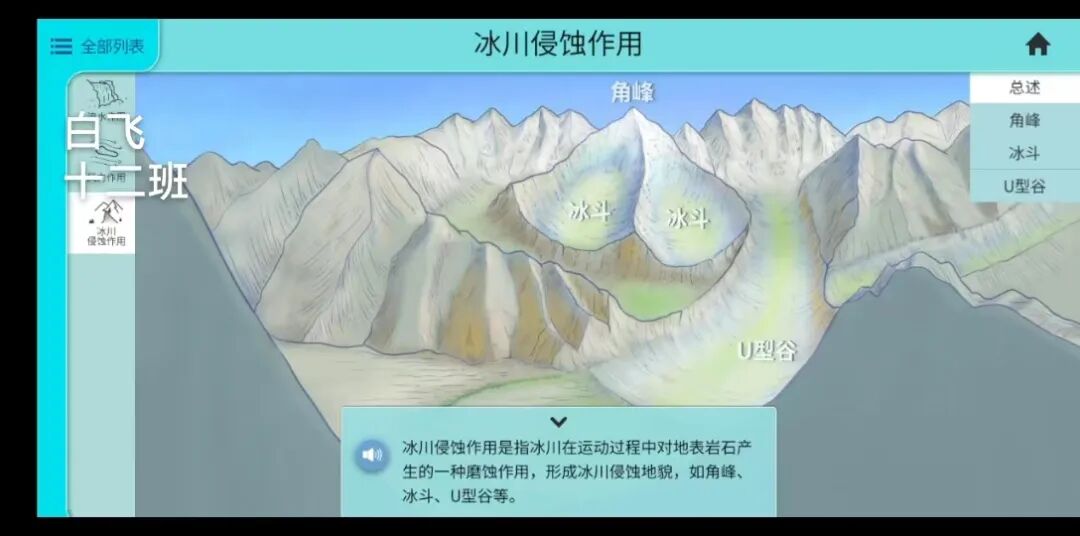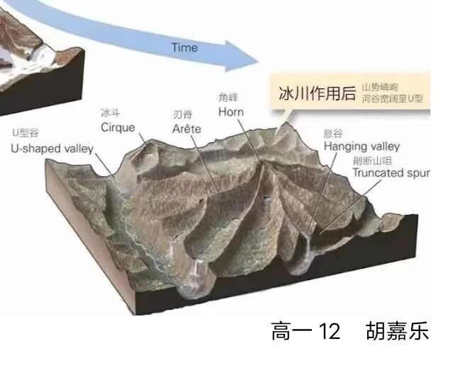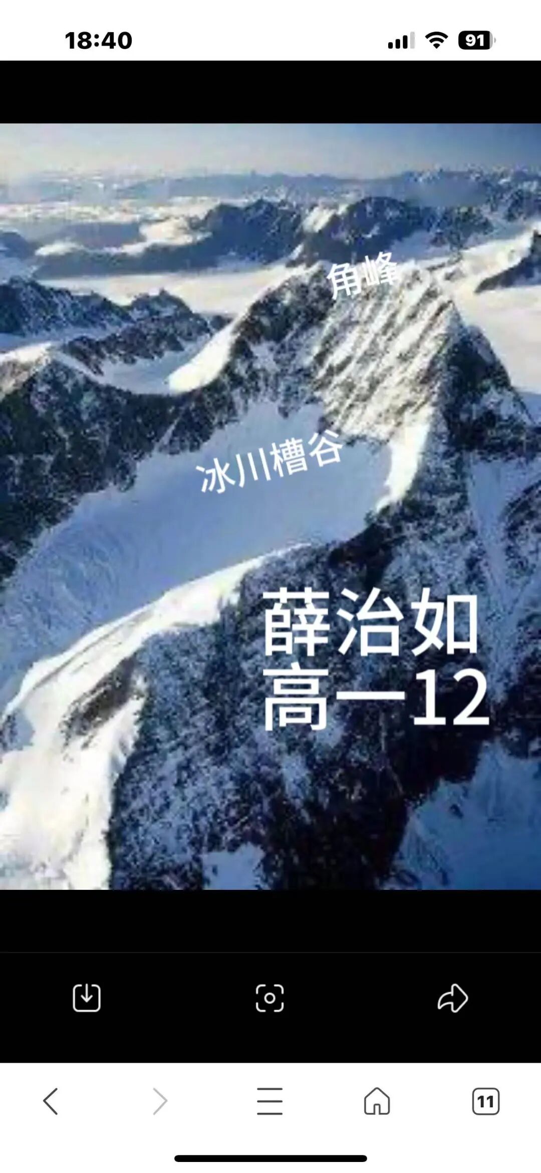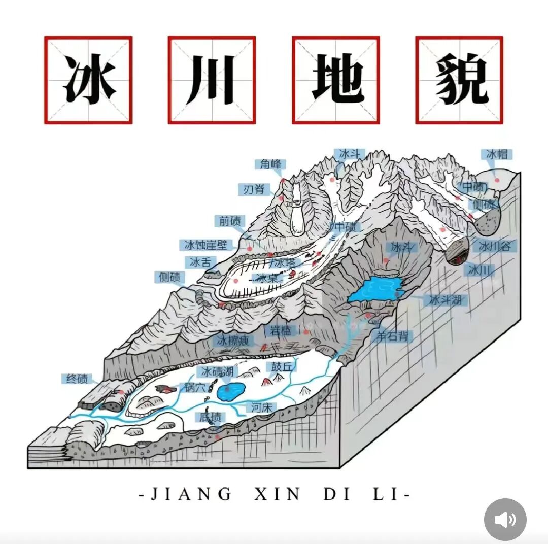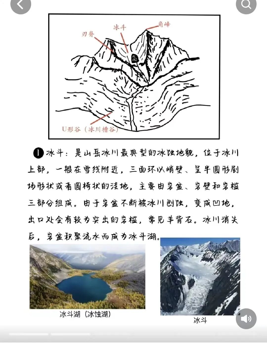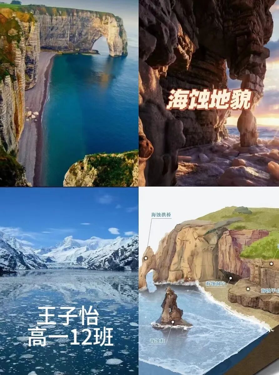 本次实践作业为:查找关于冰川的图片资料并标明地形类型(如:角峰、刃脊、冰斗、U形谷、峡湾、冰蚀湖、冰碛湖)、或者拍摄关于冰川的图片,下列图片为2023级12班的部分作业选登。