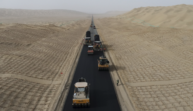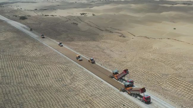 这条沙漠公路途经的区域有30多座高大的沙山,最高的沙山高度超过了100米,相当于30层楼的高度,除此之外,还有将近30处丘间洼地,最长达12公里。挖平沙山、填满洼地,对于建设者来说是一个巨大的考验。