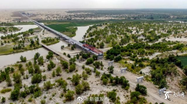 塔里木河特大桥全长将近1300米,是尉且沙漠公路全线唯一的一座桥梁,也是尉且沙漠公路成功跨越塔里木河的控制性工程。之所以设计如此之长的桥梁,主要还是为了保护当地的生态环境,减少对基本农田的占用、减少对胡杨林的砍伐。