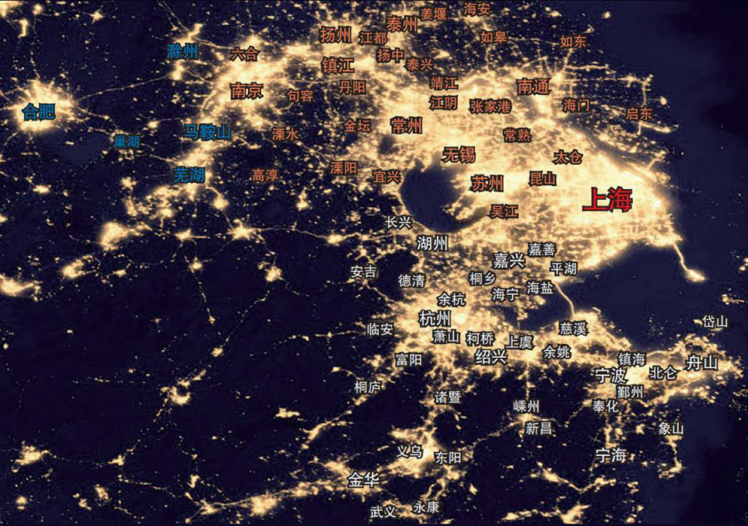 上海市地处江海交汇处,开埠至今仅170多年历史,却以惊人的速度发展成2 400多万人口的超大城市。在长三角地区城市体系中,上海市是当之无愧的中心,具有强大的辐射功能。长三角卫星夜景图片中上海市的爆爆亮光是那么醒目和耀眼,映照着周边城市,汇成一片灯光的海洋。