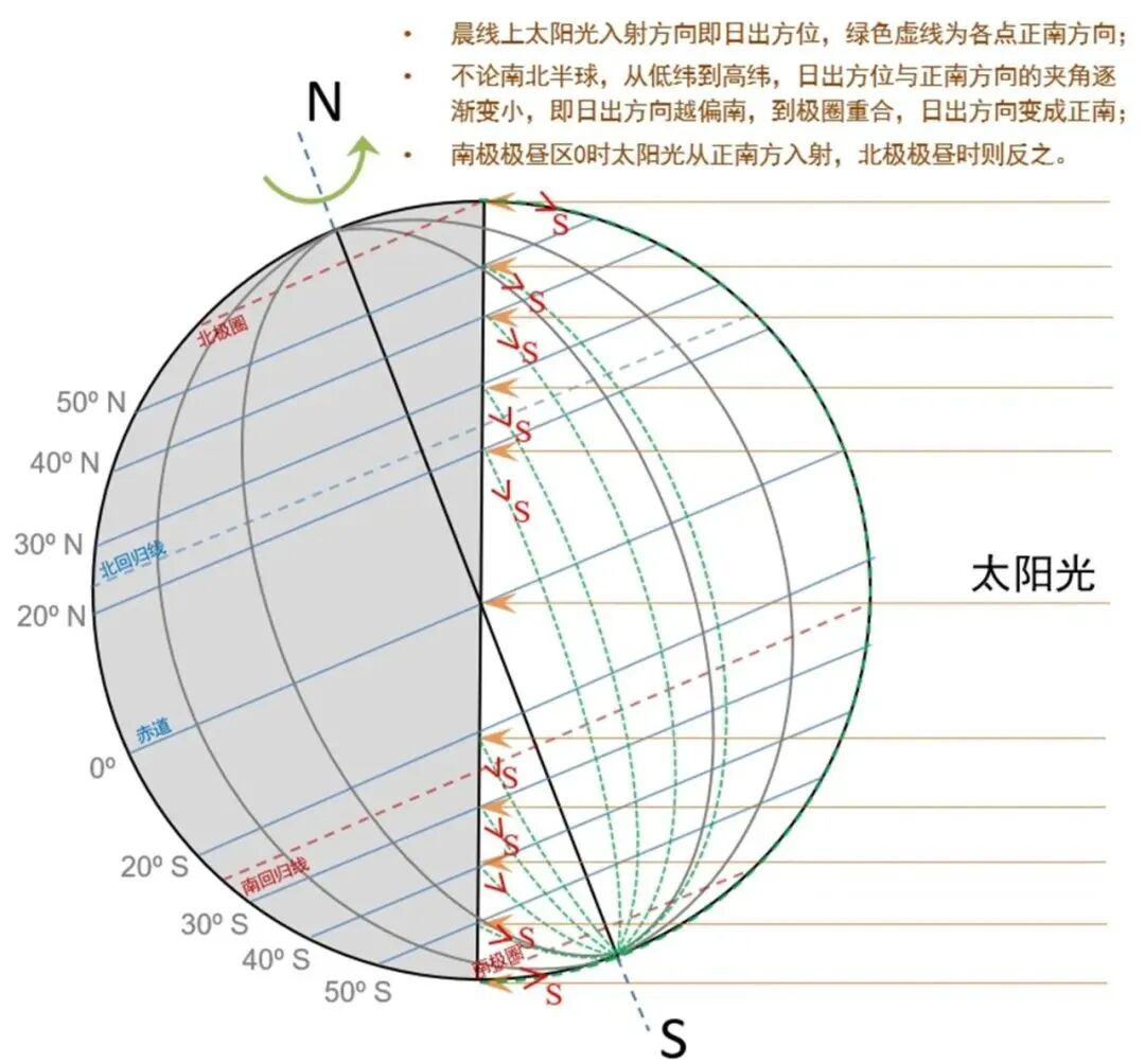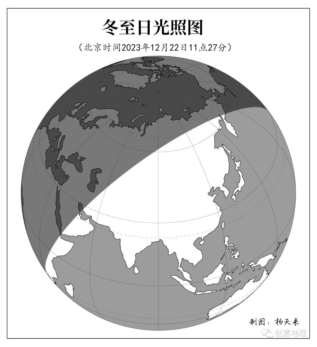 冬至是太阳直射点南行的极致,冬至这天太阳光直射南回归线,太阳光对北半球最为倾斜,太阳高度角最小,是北半球各地白昼最短、黑夜最长的一天。之后太阳直射点开始北移,北半球昼开始变长。