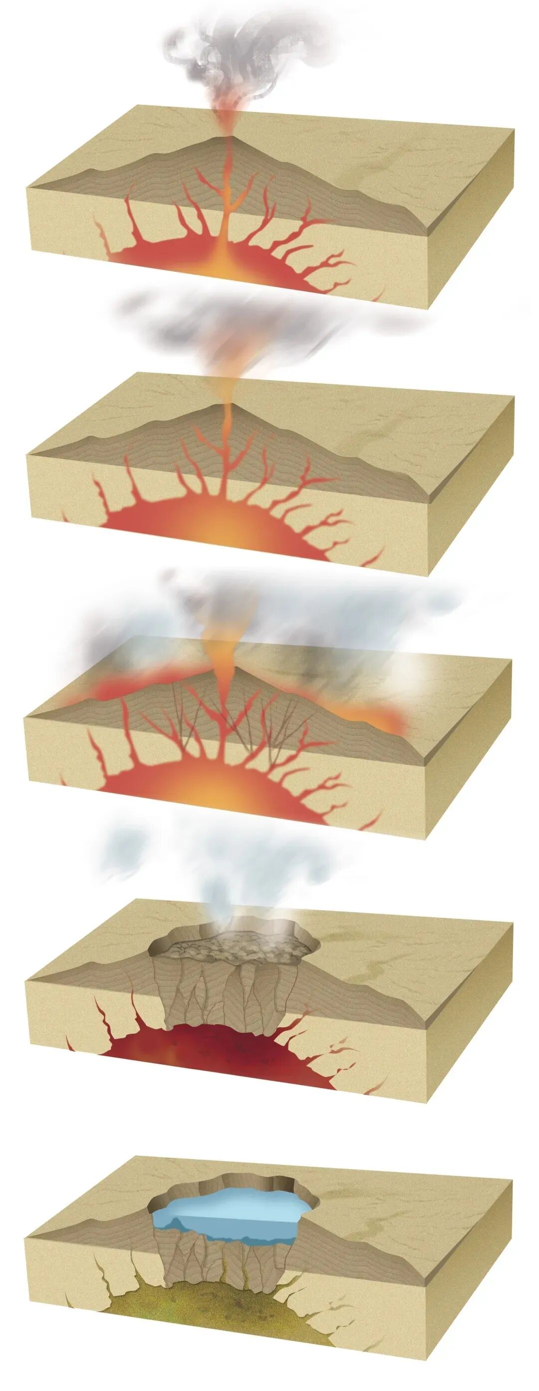 火山喷发后,喷火口内,因大量浮石被喷出来和挥发性物质的散失,引起颈部塌陷形成漏斗状洼地,即火山口。