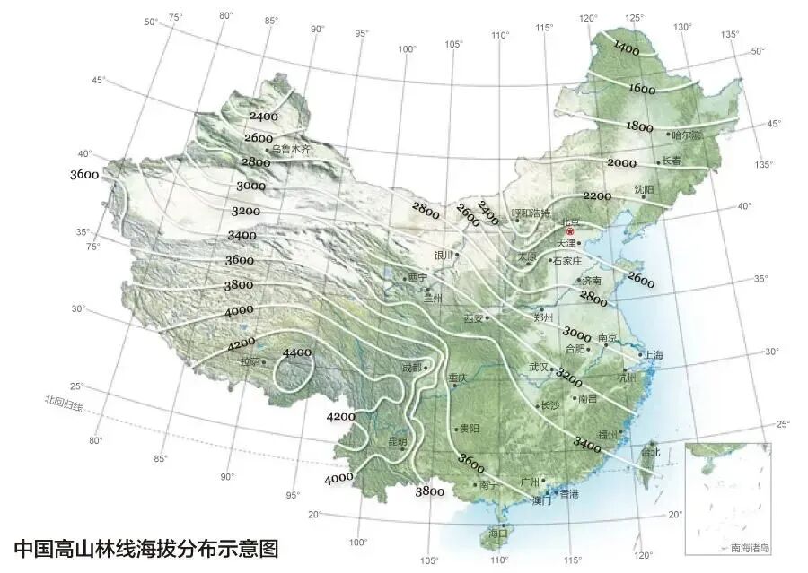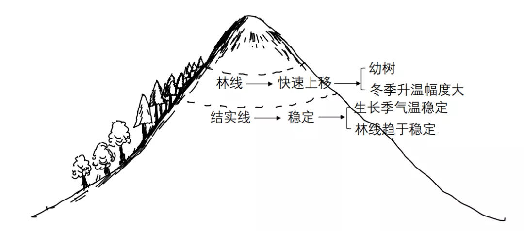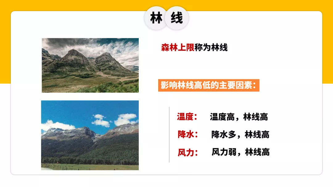 狭义的林线指山地森林分布的最高界线。一般规律为:纬度越低,林线越高;降水越多,林线越高。