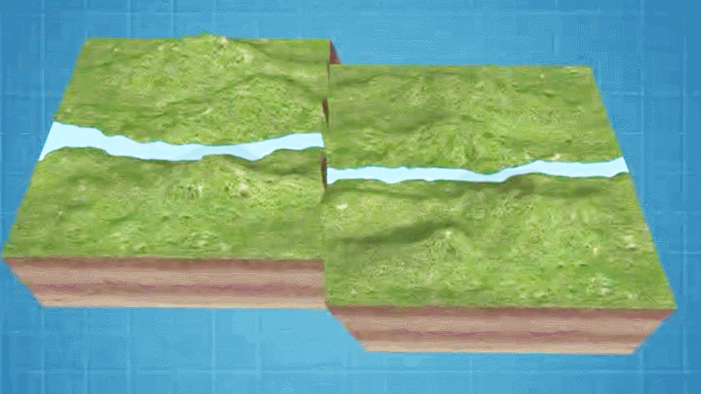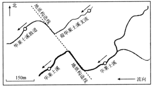 水系断错是流经活断层的河流,由于断层两盘的平移运动,使河流发生扭曲或断错,也称河谷错位或水系错位。美国加利福利尼亚州的华莱士溪100多米的断错位移被认为是多次强震错动累积的结果。下图示意华莱士溪地理位置变化。