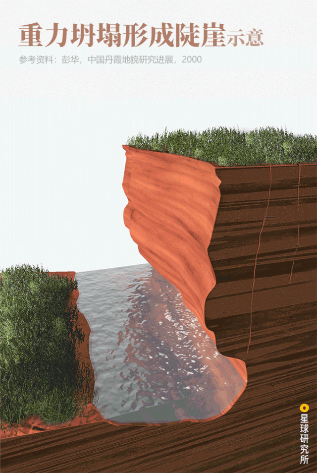 (重力崩塌形成陡崖示意;制图@郑伯容/星球研究所)