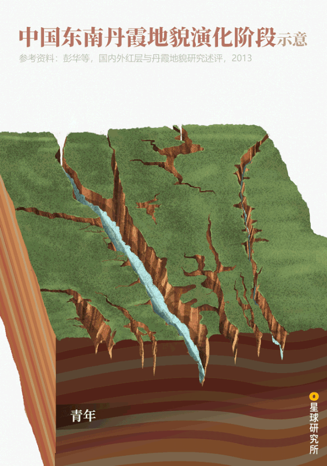 (中国东南丹霞地貌演化阶段示意;制图@郑伯容/星球研究所)