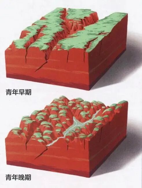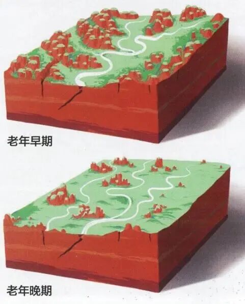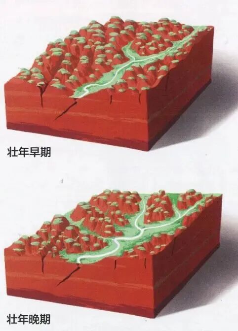 参考戴维斯的侵蚀循环理论,将这一演化过程划分为幼年期、壮年期、老年期3个阶段及“回春期”。在此基础上,再将丹霞进一步 划分为青年早期、青年晚期、壮年早期、壮年晚期、老年早期和老年晚期6个阶段,进一步完善了丹霞地貌演化模式。
