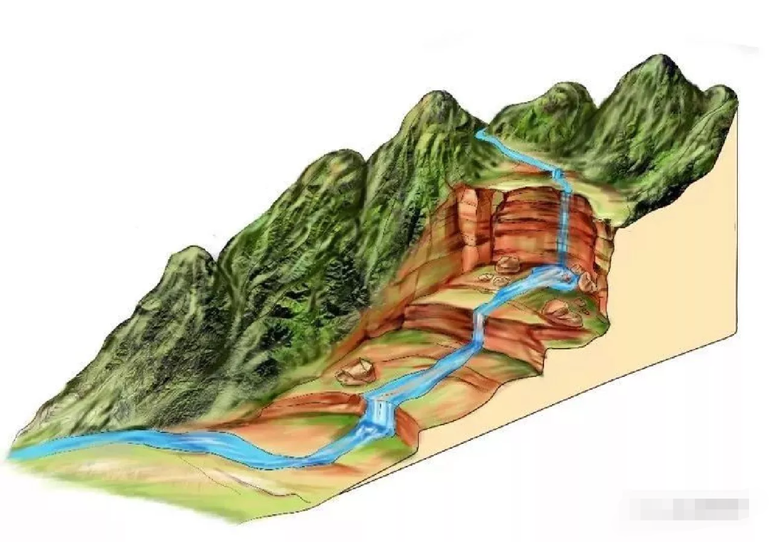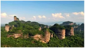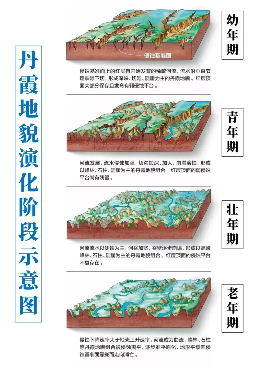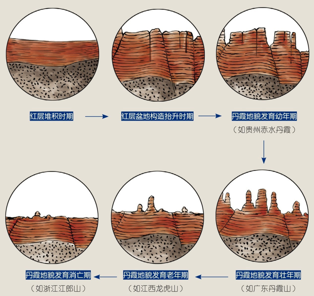 即先是沉积形成红色的砂岩或砾岩,后来随着地壳的抬升岩层断裂,经流水、风、生物等的侵蚀崩塌后就形成了丹霞地貌,从青年到壮年,再到老年的完整演化阶段。