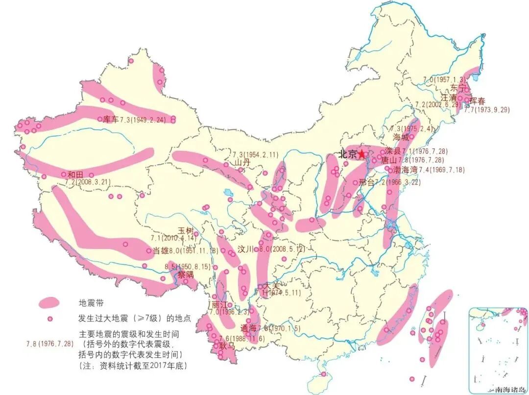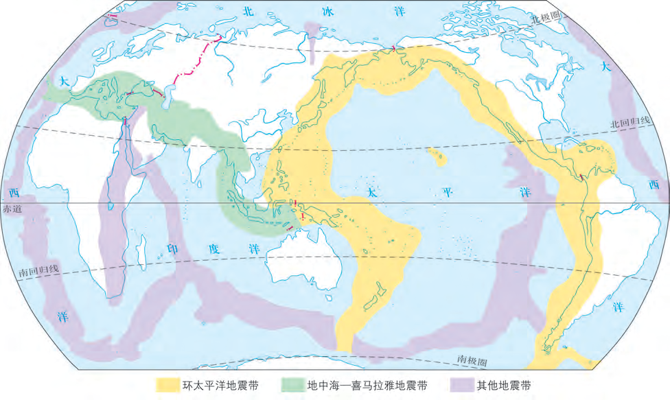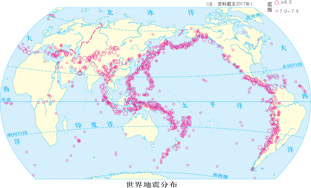 世界上的地震大多集中分布在板块交界处,呈带状分布。世界上主要有两大地震带:其一为环太平洋地震带,这里集中了世界上80%以上的浅源地震、90%以上的中源地震和几乎全部的深源地震;其二为地中海—喜马拉雅地震带,这里集中了世界上约15%的地震,其中绝大多数为浅源地震。我国位于世界两大地震带的交界地带,是一个多地震的国家。