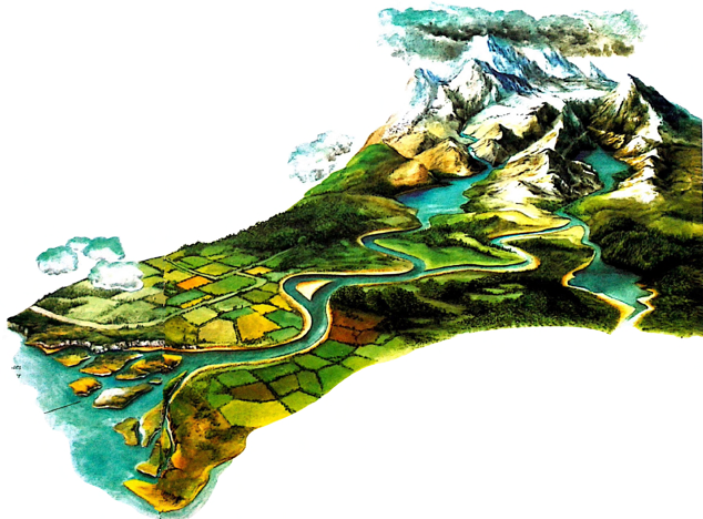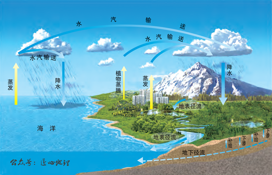 水循环指自然界的水,在太阳辐射和重力等作用下,通过蒸发、蒸腾、水汽输送、降水、下渗和径流等环节,在水圈、大气圈、岩石圈和生物圈中连续运动的过程。地球上各类水体通过水循环形成了一个连续而统一的整体。水循环包括海陆间循环、陆地内循环和海上内循环三种类型。海洋表面蒸发的水汽,被气流输送到陆地上空,在适当条件下凝结,形成降水。降落到地面的水一部分在地表流动,形成地表径流;另一部分通过下渗进入地下,形成地下径流。两者最终经江河汇集返回海洋,由此形成海陆间循环。