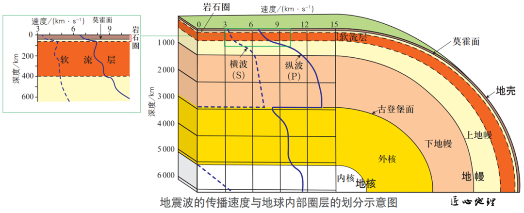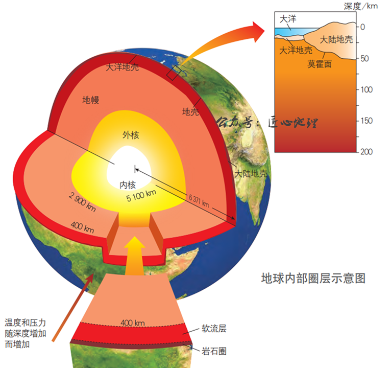 依据地震波在地球内部不同深度传播速度的差异和变化,把地球内部由外到内划分为地壳、地幔和地核三个圈层。各圈层的物质组成、密度、温度等有较大差异。
