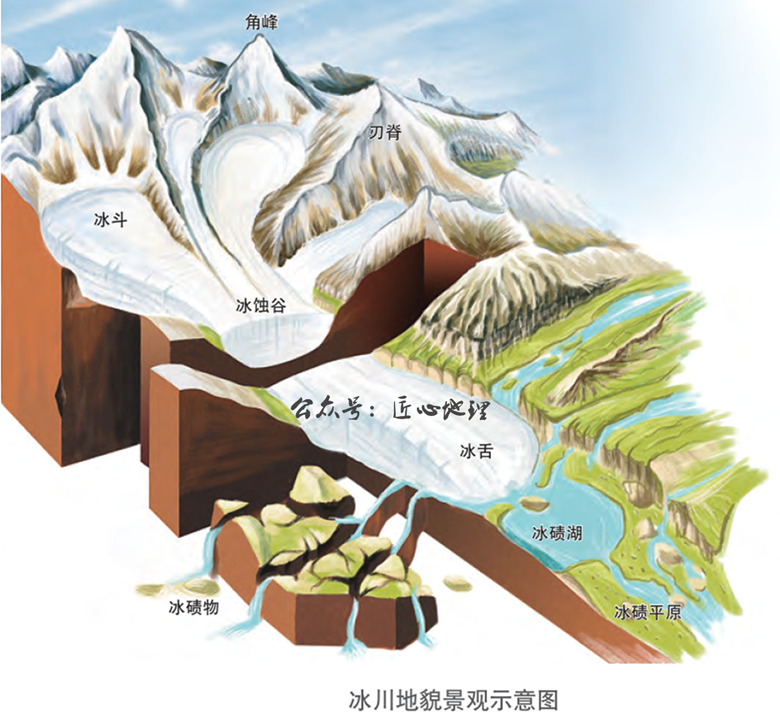 冰川侵蚀作用一般发生于冰川上游地区。巨大的冰川刨蚀地面,形成冰斗、刃脊、角峰、冰蚀谷(U形谷)等冰蚀地貌。