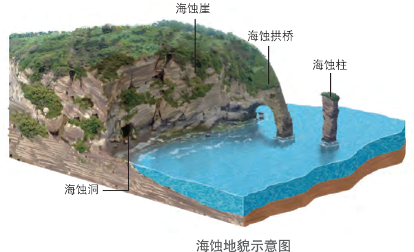 在由岩石构成的海岸地带,波浪不断地击打、侵蚀岩壁,导致岩石破碎,岩壁崩落,海岸后退,最终形成了高耸的海蚀崖、深邃的海蚀洞、各种造型的海蚀柱等海蚀地貌。