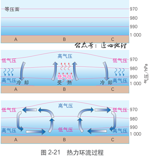 热力环流是大气运动最常见的形式。太阳辐射在各地区的分布不均,造成不同地区之间热量分布有差异。如上图,其中受热多的B地区,近地面空气膨胀上升,在高空集聚起来,使得高空大气密度增大而形成高气压,近地面空气密度减小,形成低气压。受热少的A、C两地则相反,空气因冷却收缩下沉,高空大气密度减少而形成低气压,近地面空气密度增大,形成高气压。这样,高空和近地面的同一水平面上,气压高低存在差异,产生了水平气压梯度力,促使高空气流从B地流向A、C两地高空;近地面气流从气压较高的A、C两地流向B地,并补充B地上升的空气,从而形成热力环流。记忆口诀:热上升、冷下沉、热低压、冷高压