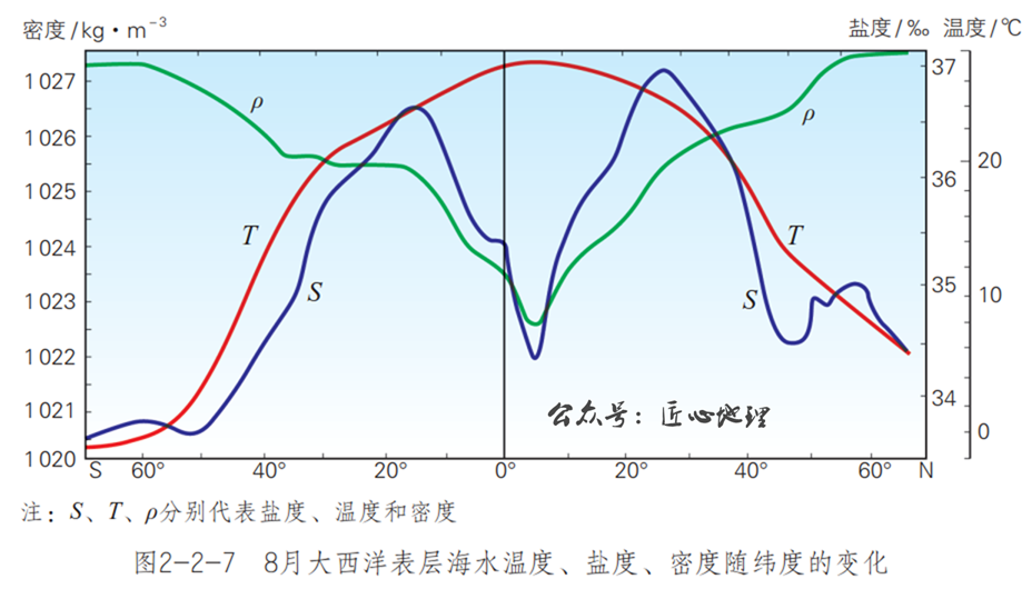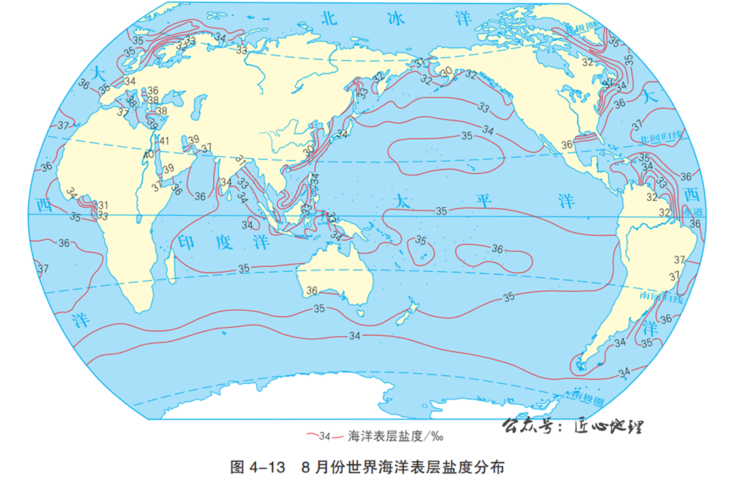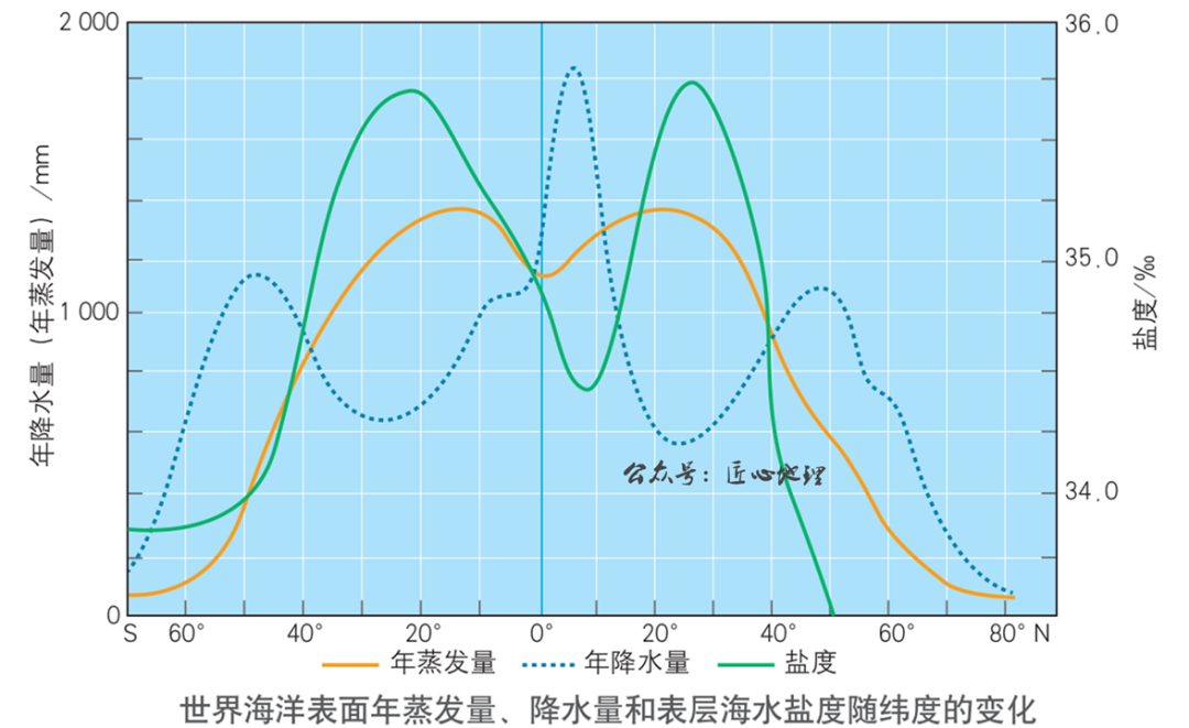 世界海洋表层海水盐度从南半球和北半球的副热带海区,分别向两侧高纬和低纬递减,呈马鞍形分布。副热带海区炎热少雨,蒸发量大于降水量,故盐度最高;赤道海区虽然温度高,蒸发强烈,但降水量也大,故盐度低于副热带海区。