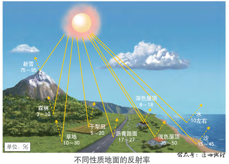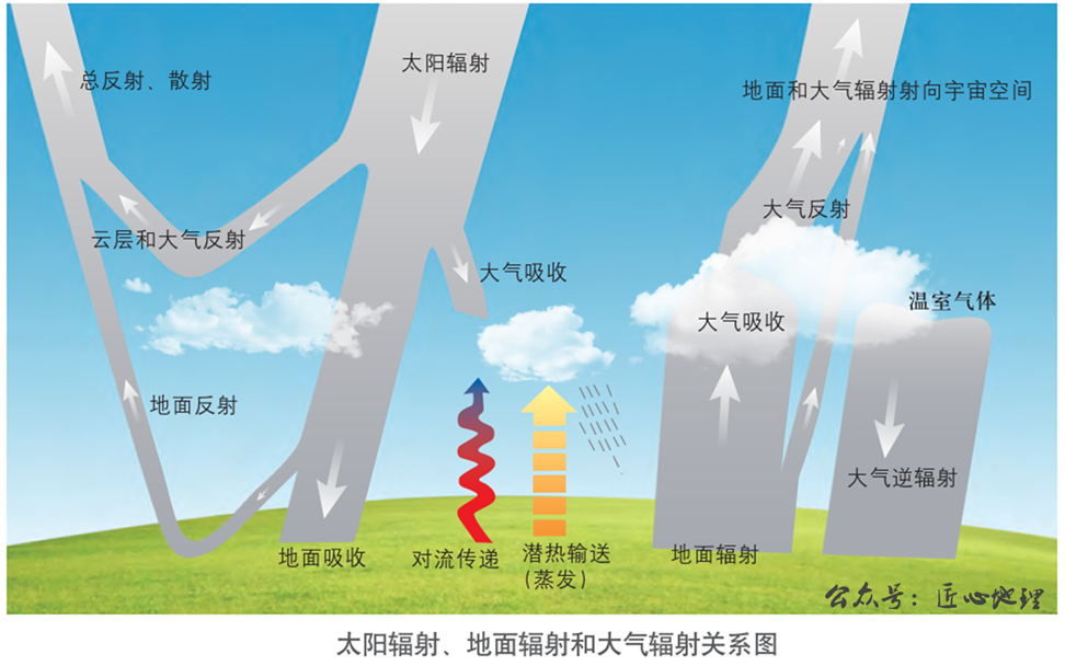 大气,尤其是对流层中的大气,主要靠吸收地面辐射而增热,地面辐射是近地面大气热量的直接来源。大气通过吸收太阳辐射和地面辐射而升温,同时也以长波辐射的形式向外释放能量。大气辐射除一部分射向宇宙空间以外,大部分射向地面,其方向与地面辐射相反,称为大气逆辐射。大气逆辐射在一定程度上补偿了地面辐射损失的热量,对地面起保温作用。大气对地面的保温作用使夜晚的气温不会太低,地表昼夜温差不会太大。总体而言,太阳支配着地球上地面和大气的能量传输过程,就全球平均而言,地面和大气大致维持在一个能量转换平衡的状态。