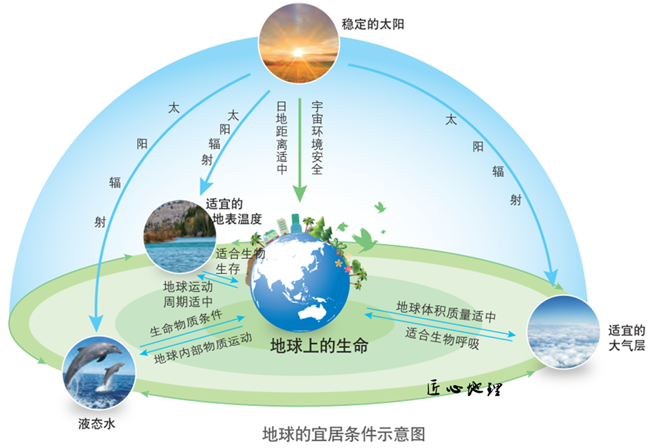 地球处于较安全的宇宙环境中。在太阳系中,太阳正处于壮年期,状态稳定;大小行星各行其道,互不干扰,为地球提供了较安全的宇宙空间。地球具有适宜的温度条件。地球与太阳的距离适中,使地球近地表1.5米的平均气温保持在15℃左右。离太阳很近的星球,接收的太阳辐射过强,温度过高,生命难以存在;离太阳很远的星球,温度过低,生命无法存活。且地球自转与公转的运动周期也较适中,使地球表面的温差较小,有利于生命过程的发生和发展。地球具有适宜的大气条件。地球的体积与质量适中,适度的引力吸引了适量的大气,使大气既不易散失,又不至于过分浓厚,形成了包围地球的适宜大气层。大气层不仅给地球提供了保护,而且经过漫长的演化,形成了今天适合生物生存的现代大气。
