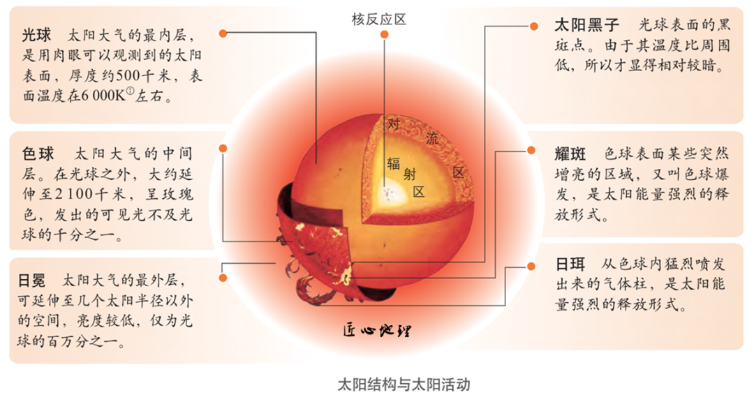 太阳的一些活动对地球的自然环境和人类活动也会产生影响。人类能够直接观测到的是太阳的大气层。太阳大气从里向外分为光球、色球和日冕三层,各层皆有一些大规模的太阳活动。太阳活动的类型较多,有太阳黑子、耀斑、日珥和太阳风等,其中太阳黑子和耀斑是太阳活动的主要标志。
