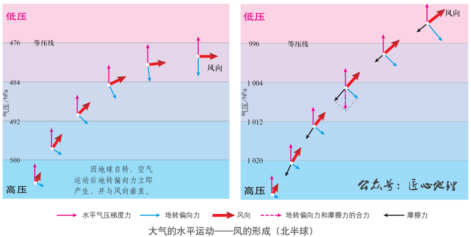左图为高空风的形成示意。在不受摩擦力影响的情况下,当地转偏向力增大到与水平气压梯度力大小相等、方向相反时,风向与等压线平行。在北半球背风而立,左为低压,右为高压。右图为近地面风的形成示意。在受摩擦力影响的情况下,当地转偏向力和摩擦力的合力与水平气压梯度力相平衡时,风向斜穿等压线,由高压吹向低压。在北半球背风而立,左前为低压,右后为高压。