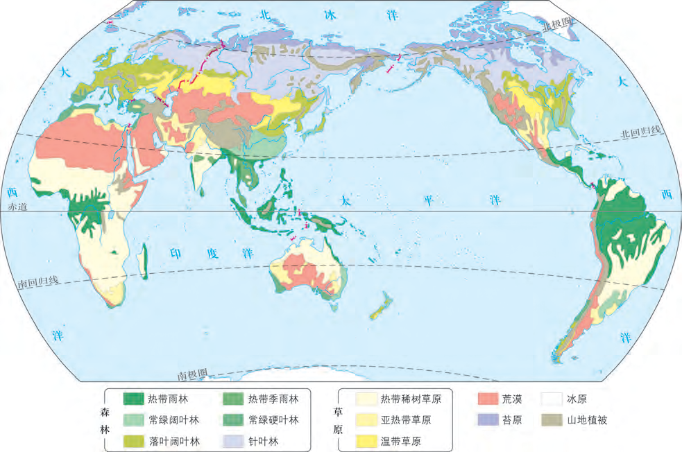 自然界中,不同地区由于气候、地形、土壤等环境条件不同,会形成不同的植被类型。
