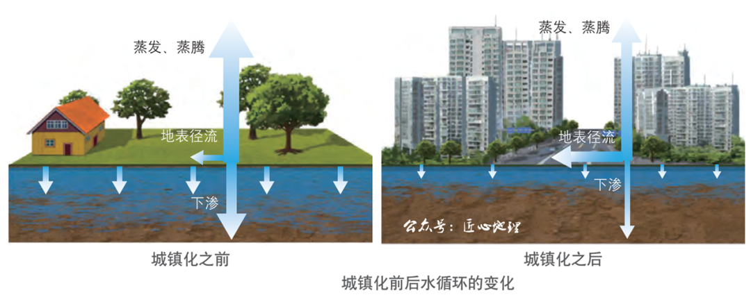 受人类活动的影响,城镇化地区地表性质发生了很大变化,导致水循环存在显著差异。主要表现为城市不透水地面比重增加,城市地表蒸发和蒸腾量减少,地表径流量显著增多,而下渗补充地下水的径流量减少。