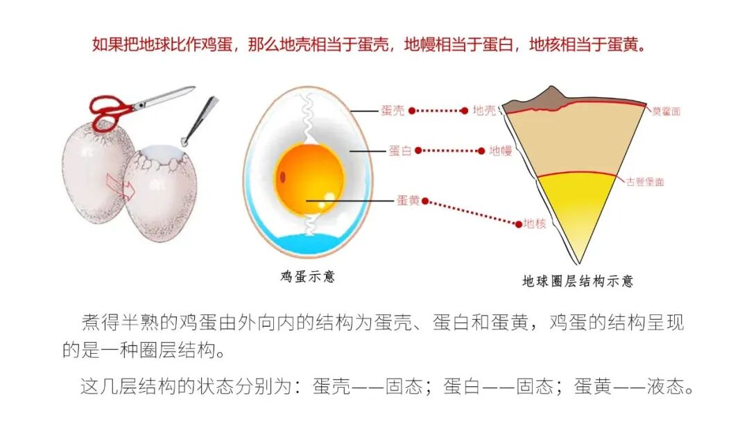 如果把地球比作鸡蛋,那么地壳相当于蛋壳,地幔相当于蛋白,地核相当于蛋黄。煮得半熟的鸡蛋由外向内的结构为蛋壳、蛋白和蛋黄,鸡蛋的结构呈现的是一种圈层结构。这几层结构的状态分别为:蛋壳——固态;蛋白——固态;蛋黄——液态。