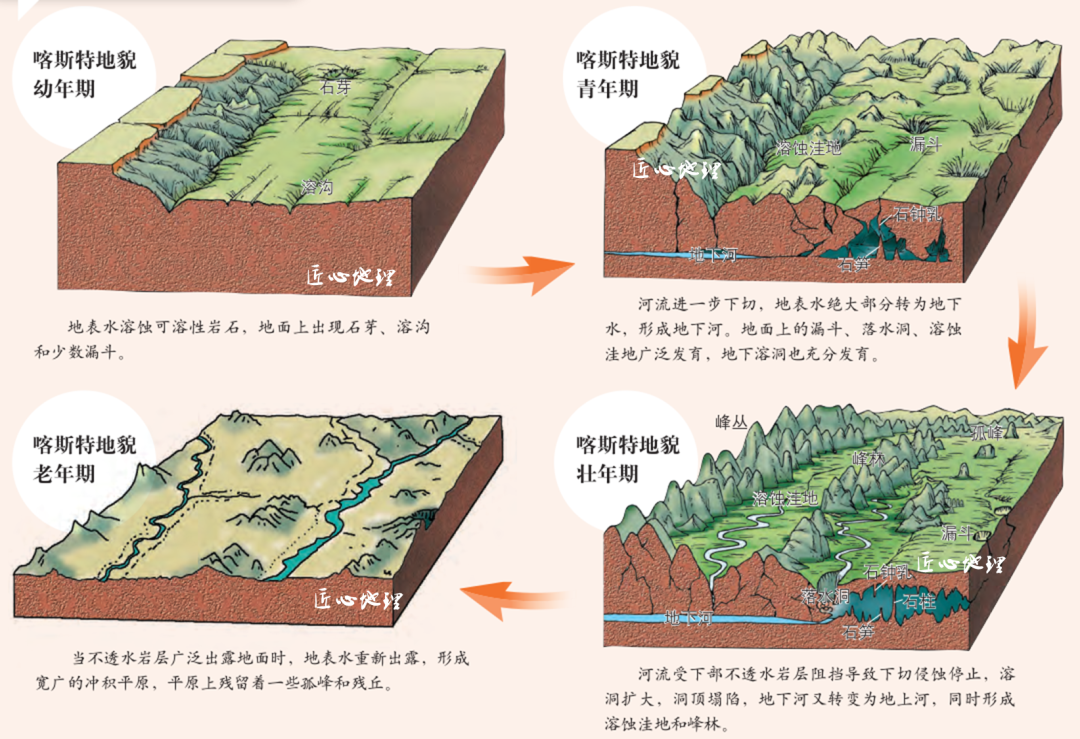 喀斯特地貌的发育过程示意