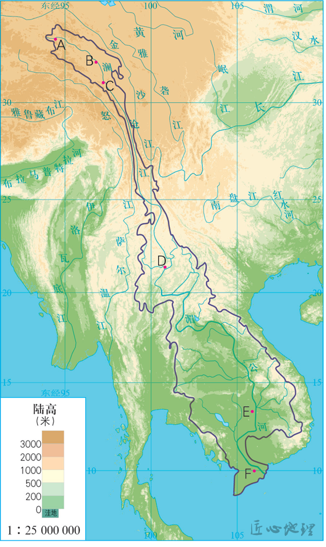 澜沧江流经横断山、云贵高原以及中南半岛北部高地时,由于落差大、水流急,水流向下的侵蚀作用强,多形成“V“”形峡谷。(B点附近)