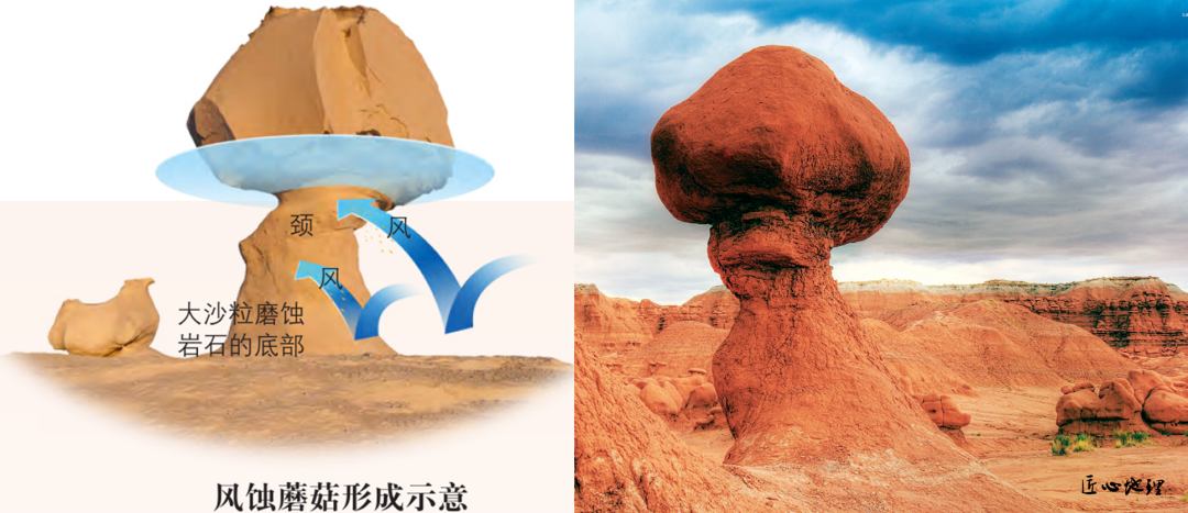 风蚀蘑菇:在荒漠地区,大的沙粒对岩石下部磨蚀严重,常常把岩石磨蚀成蘑菇状。