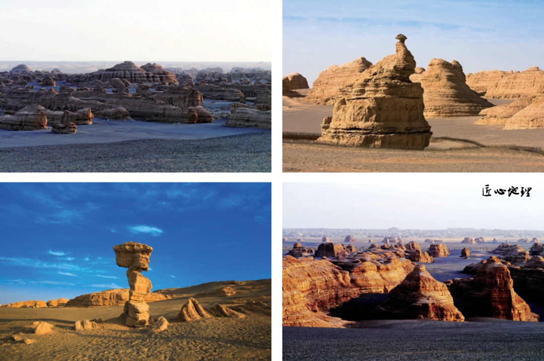 由风蚀作用形成的地表形态,叫作风蚀地貌。被风长期吹蚀的岩石或土体,呈现出千姿百态的形态,被形象地称为风蚀蘑菇、风蚀柱、风蚀壁龛等。