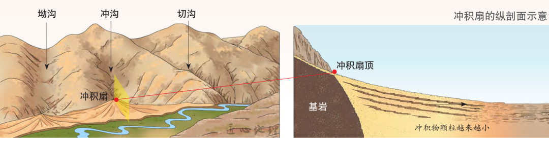 山区的沟谷流水作用形成了沟谷地貌。在流水的侵蚀作用下,首先形成切沟;切沟进一步发展成冲沟,宽度和深度都变大,横剖面呈V形,是侵蚀最强烈的阶段;沟谷发育到衰老阶段的坳沟,宽度变大,深度变小。在流水的沉积作用下,山前形成冲(洪)积扇。