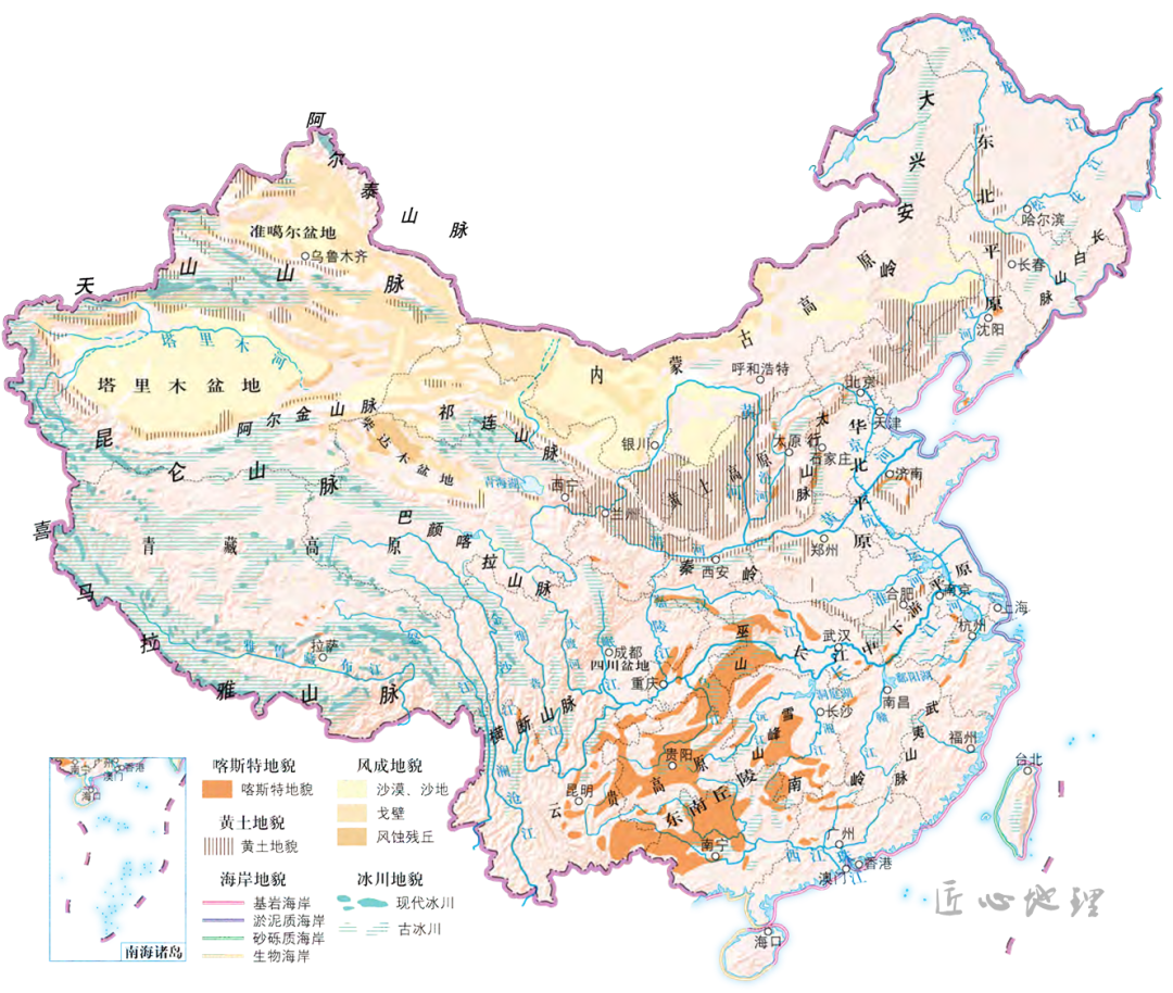 中国部分地貌类型分布示意图