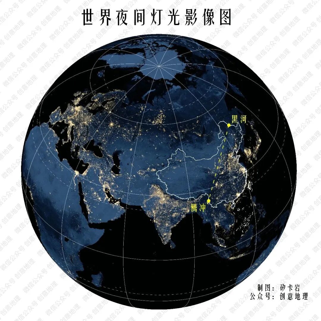 【地理图库】世界夜间灯光影像图(含有中国人口密度分界线)