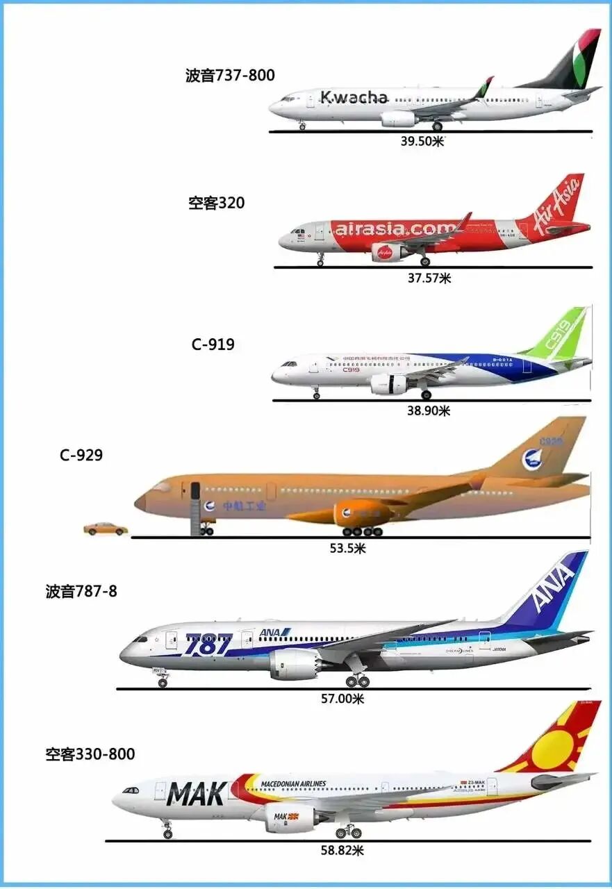【地理图库】世界大飞机尺寸对比,中国的C-919、C-929位列其中