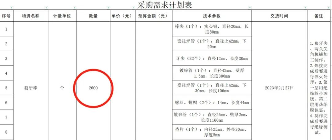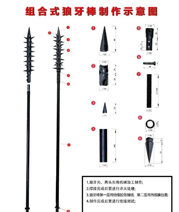 根据招标参数来看,这批狼牙棒由9个部分组成,分别为实心棒料、钢筋狼牙尖等。整个狼牙棒采用绝缘胶带和热缩膜包裹,即使与印军的电击三叉戟发生接触也不会对我军士兵造成电击伤害。这批狼牙棒总长度达163厘米,不仅可以对敌方实施有效的刺击,还可以利用尾部的尖刺进行反击。
