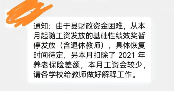 财政收入持续下滑,让本已不宽裕的县级财政雪上加霜,导致教师奖金发放原已经力不从心,现在更是捉襟见肘。