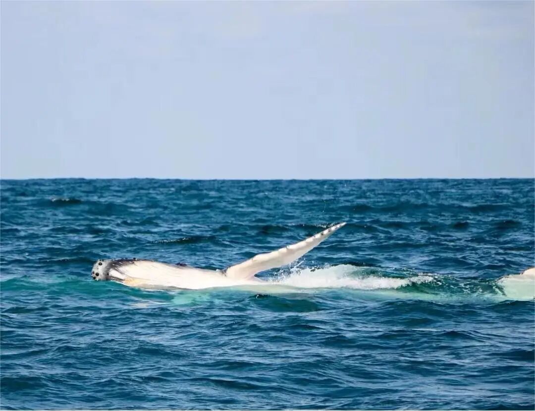 于是,我乘船来到这片海域。“快看!好多鲸鱼啊!”我站在船的甲板上,顺着声音看向那片湛蓝海面的不远处,只见有鲸鱼的尾高高翘起,有的向空中喷着水,有的就在浮在海面上畅游着……