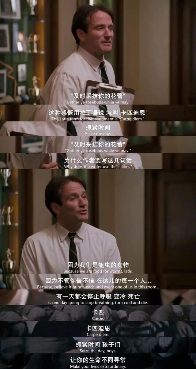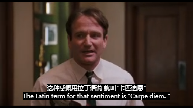 比如电影《死亡诗社》中,基廷老师带着威尔顿学校的学生们观看校友的黑白照片时,说出了这句电影史上的金句之一:Carpe diem, seize the day, boys, make your lives extraordinary. 把握今朝,抓住现在,年轻人,去创造不同凡响的人生。