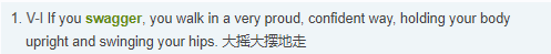 还引申出动词swagger,表示“大摇大摆”这类贬义的意思:
