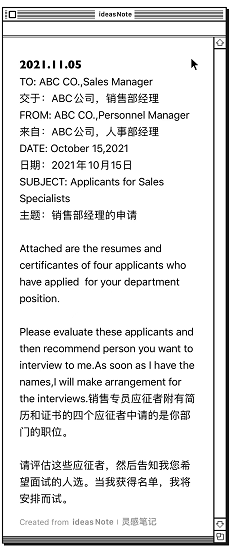 还有一个单词是“memo”这是一个缩写形式,它的完整表达是“memorandum”,指的是“备忘录、备忘便条”的意思,常用来提醒日常的行程、会议或待办事项等,它没有固定形式,文件、字条、电子邮件等均可: