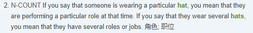 最后,关于hat还有一个知识点,大家也要注意一下,hat最基本的意思是“帽子”,但还可以进一步引申为“角色、职位”: