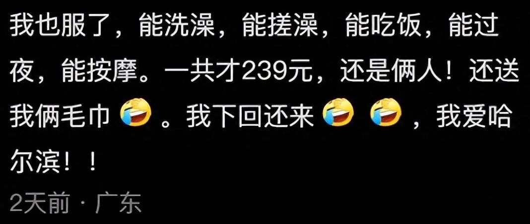 不仅如此,还有网友提到了哈尔滨的洗浴文化,他们说:来到哈尔滨,一定要去当地的洗浴中心体验一下,这里的搓澡师傅非常专业,无论是男生还是女生,都可以得到很好的服务,搓完澡之后,感觉整个人都轻松了。