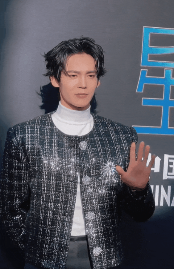 红毯上,于适穿着一身黑色的西装,精心打理的头发和精致重工的小香风服装,就像暗夜王子一般高贵,奢华。