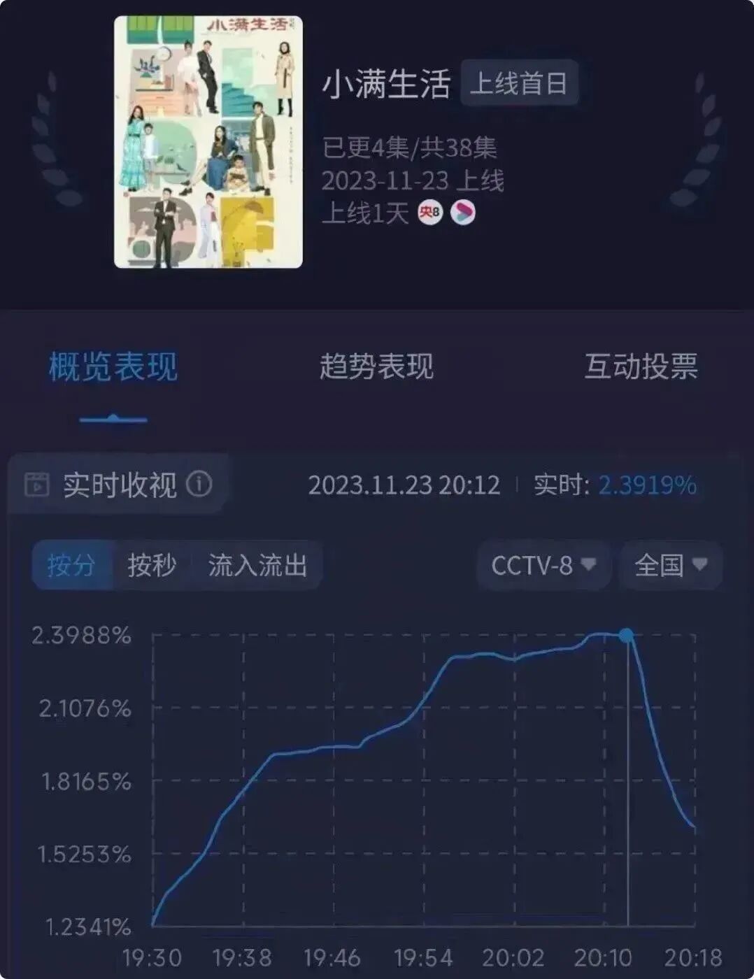 但好在电视剧《小满生活》的上线,让观众看到了生活剧的爆款潜力。根据数据显示,这部剧上线首日就拿下了收视第一的成绩。从方方面面的表现来看,《小满生活》的爆款潜力十足。