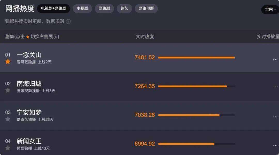电视剧《一念关山》上线就拿下了热度榜单第一,成绩不输大IP《南海归墟》,关键是刘诗诗带动的播放量底盘也得到了不错的口碑反馈。